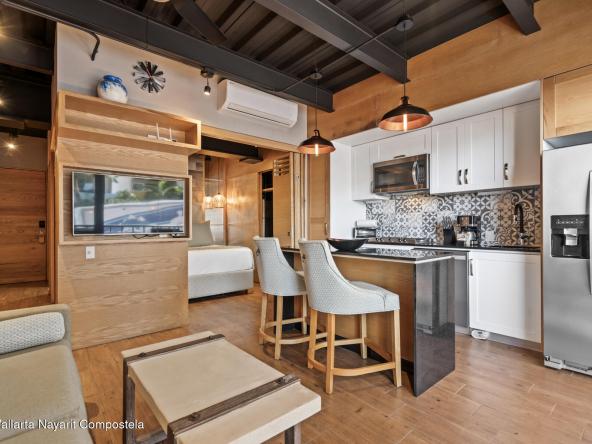 Tucked right in the heart of the Zona Romantica, this building is one of the most in-demand addresses in the area. Its unique dual entrances makes walking to all the best restaurants, cafes, and shops an absolute breeze.Unit 108 it’s flooded with natural light, spacious spaces and has gorgeous mountains and city views. The 360-degree view from the rooftop is insane; you can see the ocean, the mountains, and the city.They really paid attention to the details here. You’ll find these beautiful, handcrafted Mexican touches and designer materials throughout the hallways and common areas–it has that authentic Vallarta feel but with a sleek, modern twist. It’s no wonder this building is so popular. You really have to see it for yourself.