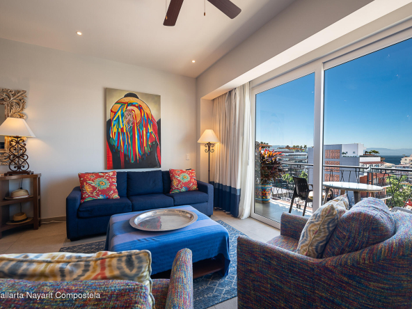 This serene and private corner condominium opens to spectacular views of manicured gardens meandering walkways, fountains and the Ocean. With windows on three sides, its filled with light, textures of Mexico and curated furnishings, truly a place that soothes the heart. Beloved by generations, Puesta Del Sol is known for its architecture, impeccable maintenance, mature gardens, on site administration and concierge services. Just steps away from gallery row, the Malecon and Vallarta’s most celebrated restaurants Este tranquilo y privado condominio en esquina ofrece espectaculares vistas a jardines impecables, senderos serpenteantes, fuentes y el oceano. Con ventanas en tres de sus lados, se llena de luz, texturas mexicanas y muebles cuidadosamente seleccionados, un lugar que
