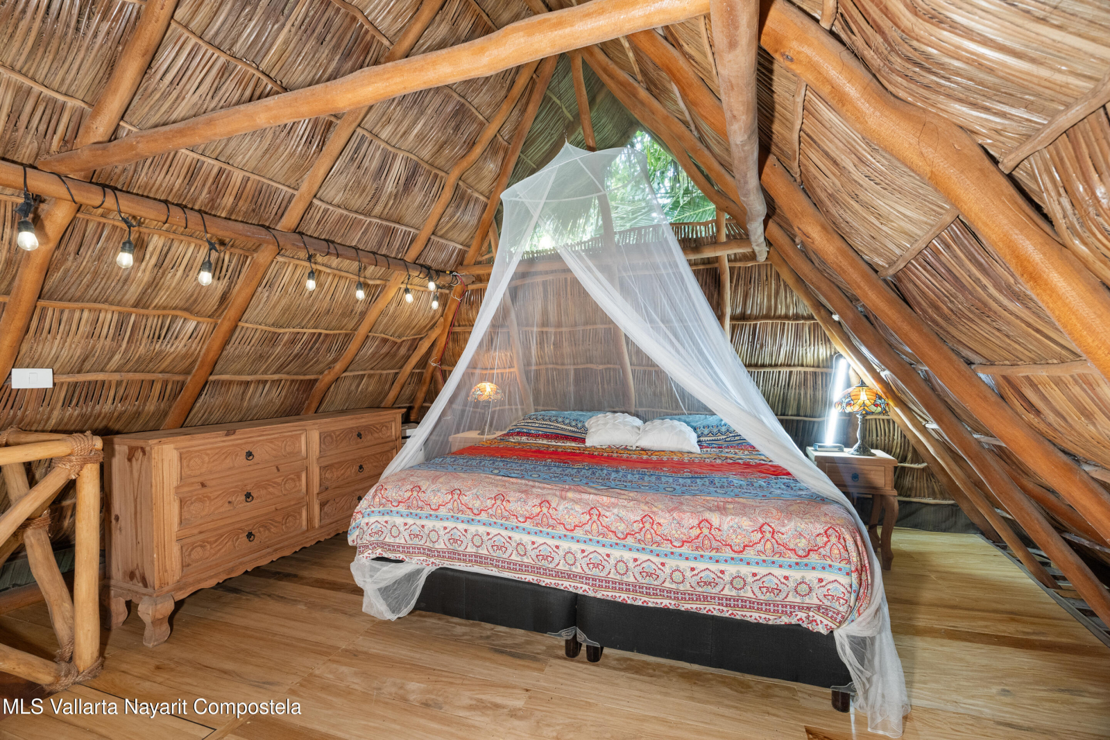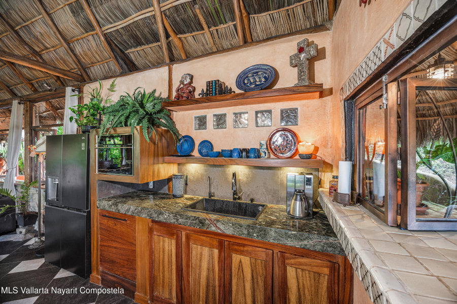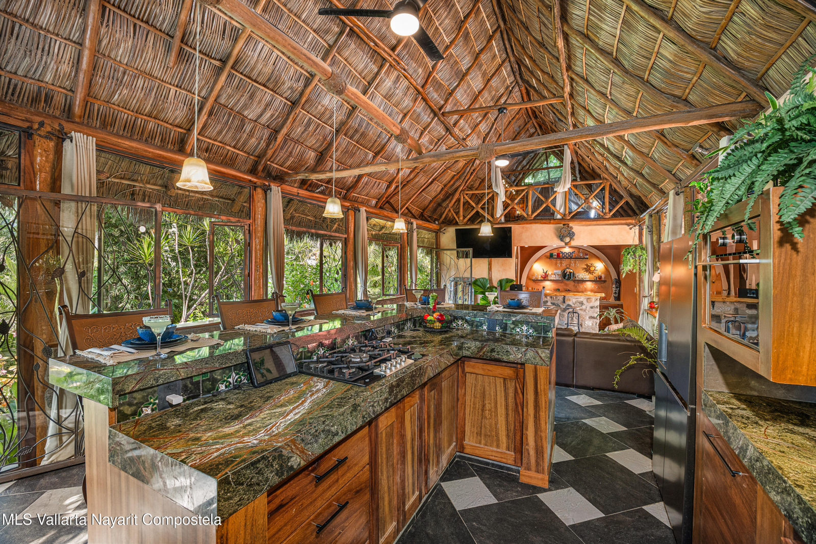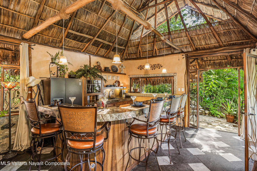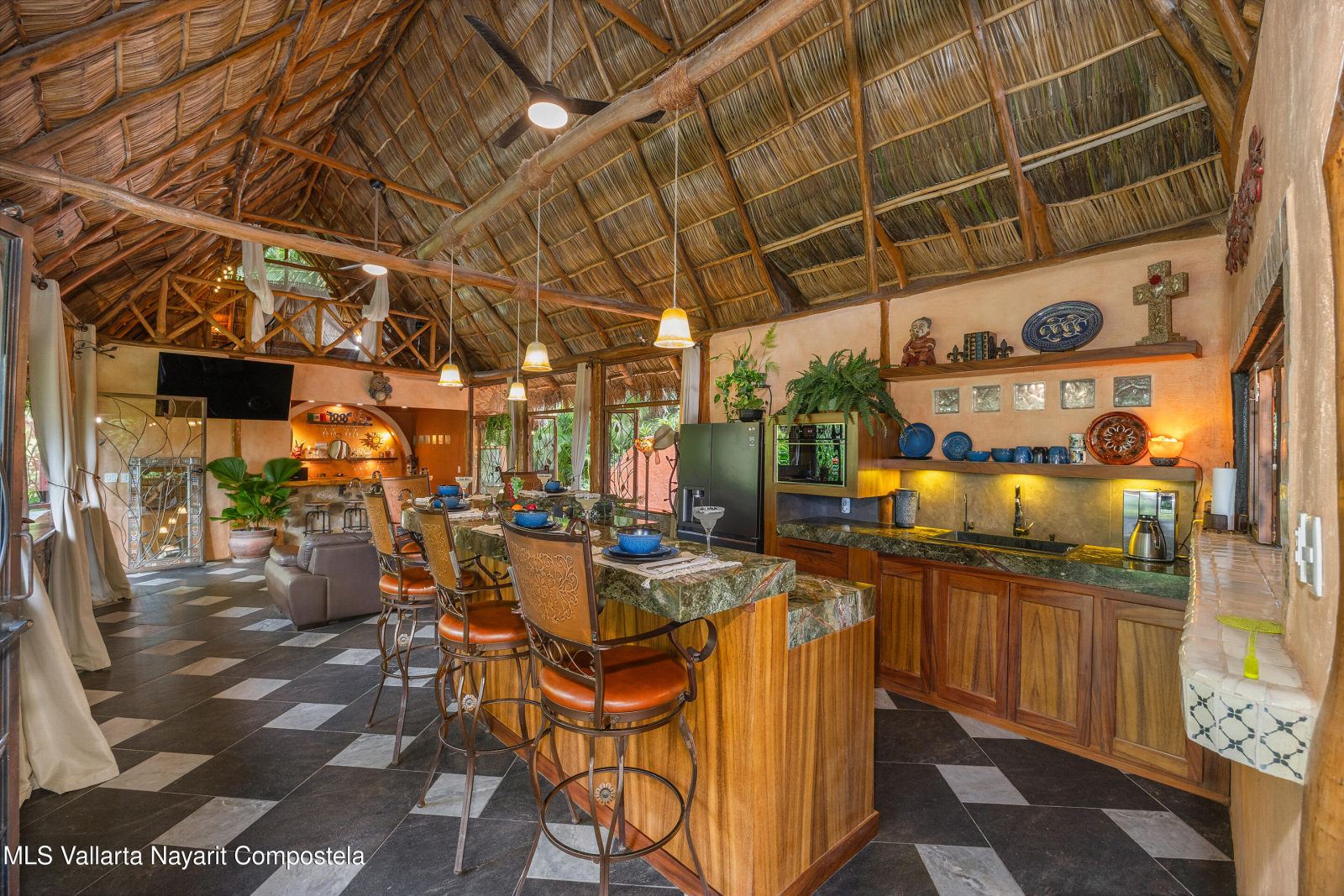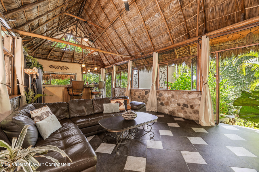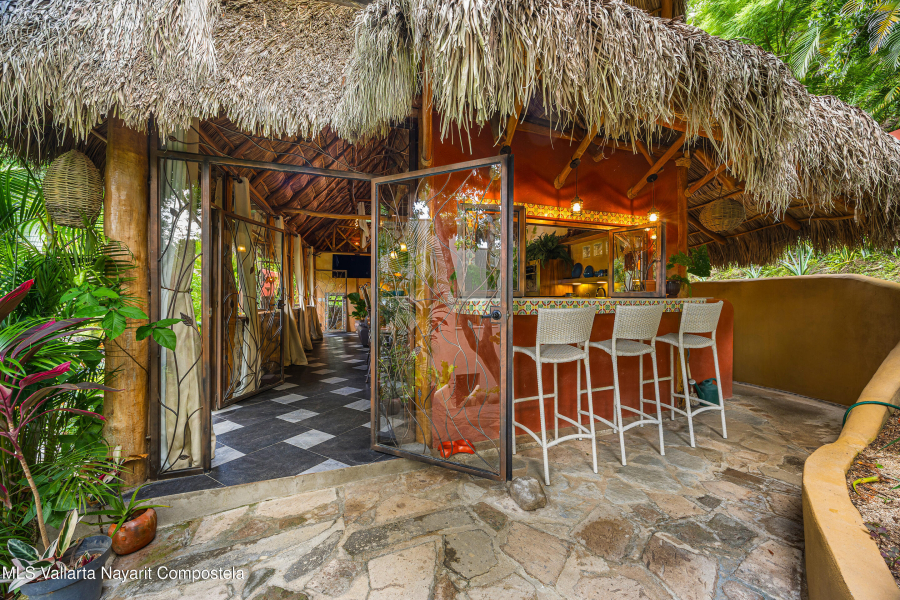 Discover a rare opportunity to own a piece of paradise within a sprawling, meticulously maintained, 3 bedroom, 3 bath sanctuary. This unique estate offers a perfect blend of luxurious Mexican architecture and unparalleled investment flexibility. The centerpiece is a spacious living area defined by a soaring palapa roof, creating an expansive, airy great room. The property features four casitas and 2 pools/hot tub, offering exceptional versatility. Set on an expansive lot, the grounds feel like a private botanical garden. The mature lush landscaping provides a sense of privacy and tranquility. As evening falls, the property transforms, illuminated by beautiful, meandering pathways that guide you through the tropical foliage and connect the main house to the casitas.