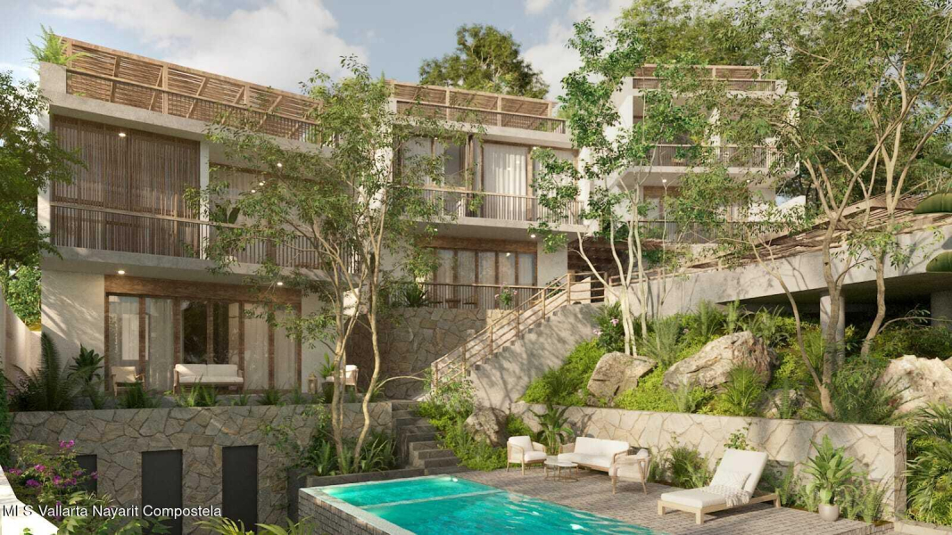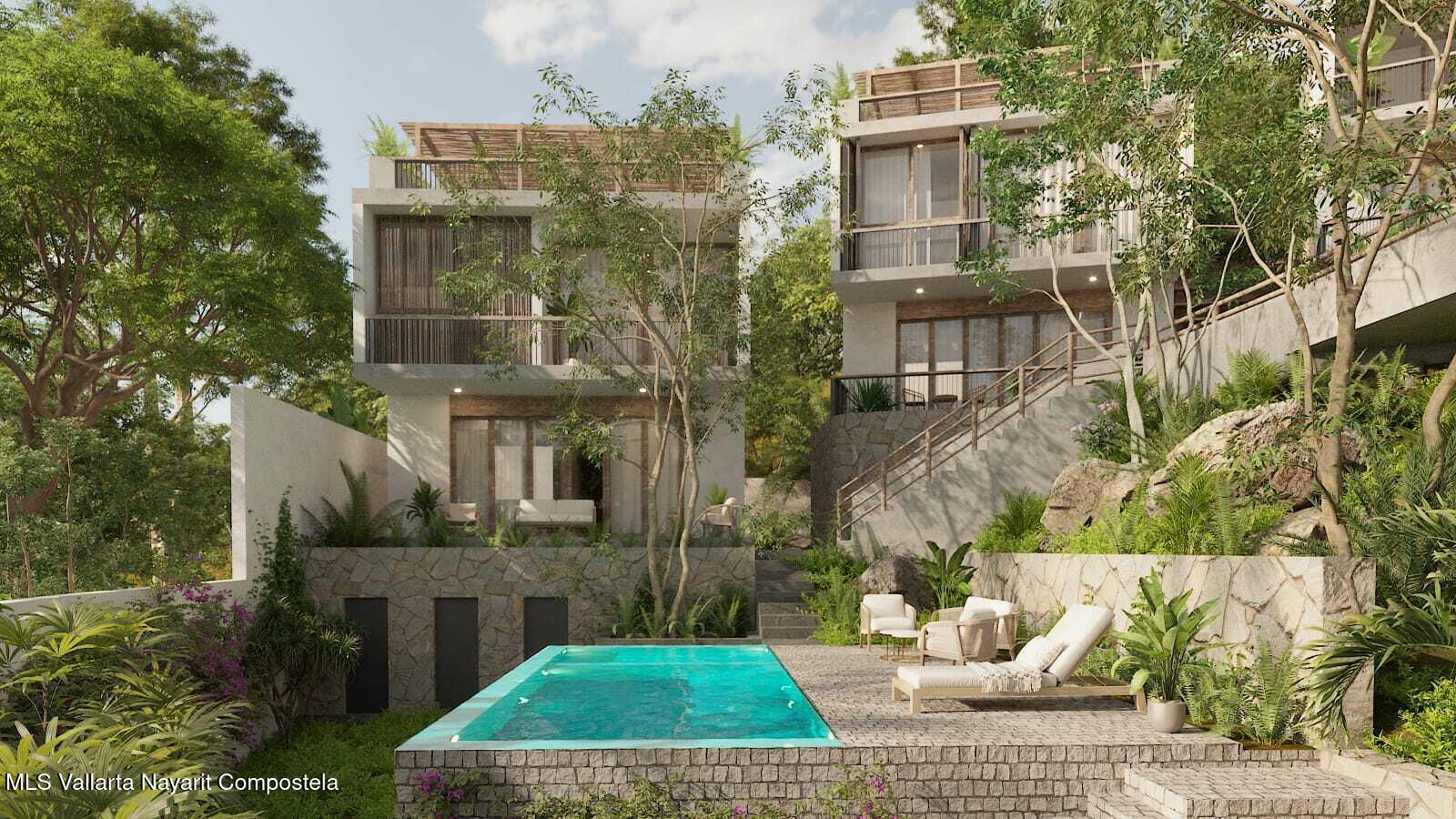 Casa Loma is an exclusive boutique development nestled on a peaceful jungle hillside in Sayulita. This elegant 3-bedroom + flex room, 3.5-bath villa combines contemporary design with natural materials, lush landscaping, and a warm, modern aesthetic.The home features bright interiors with floor-to-ceiling windows, private outdoor living spaces, and seamless indoor/outdoor flow. Residents enjoy access to a serene central pool with sun loungers, stone terraces, and beautifully landscaped tropical gardens.A rare low-density retreat offering privacy, comfort, and elevated coastal living–just minutes from the heart of town.