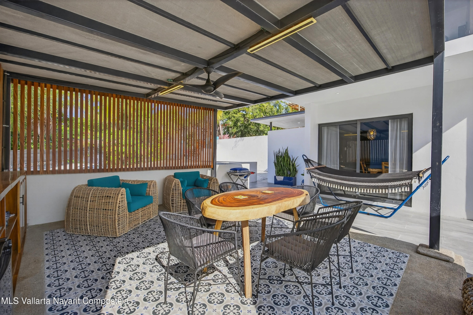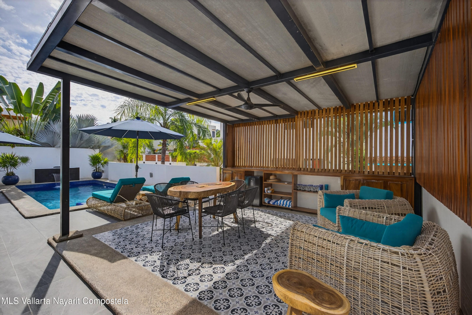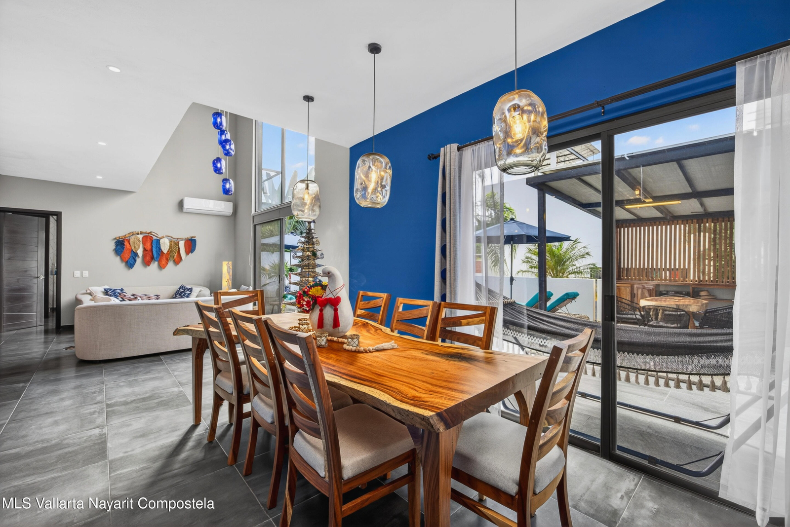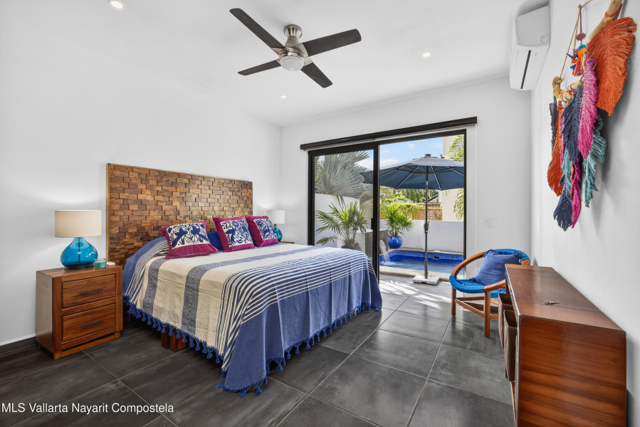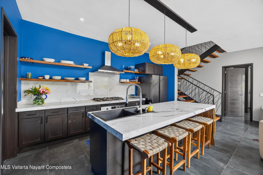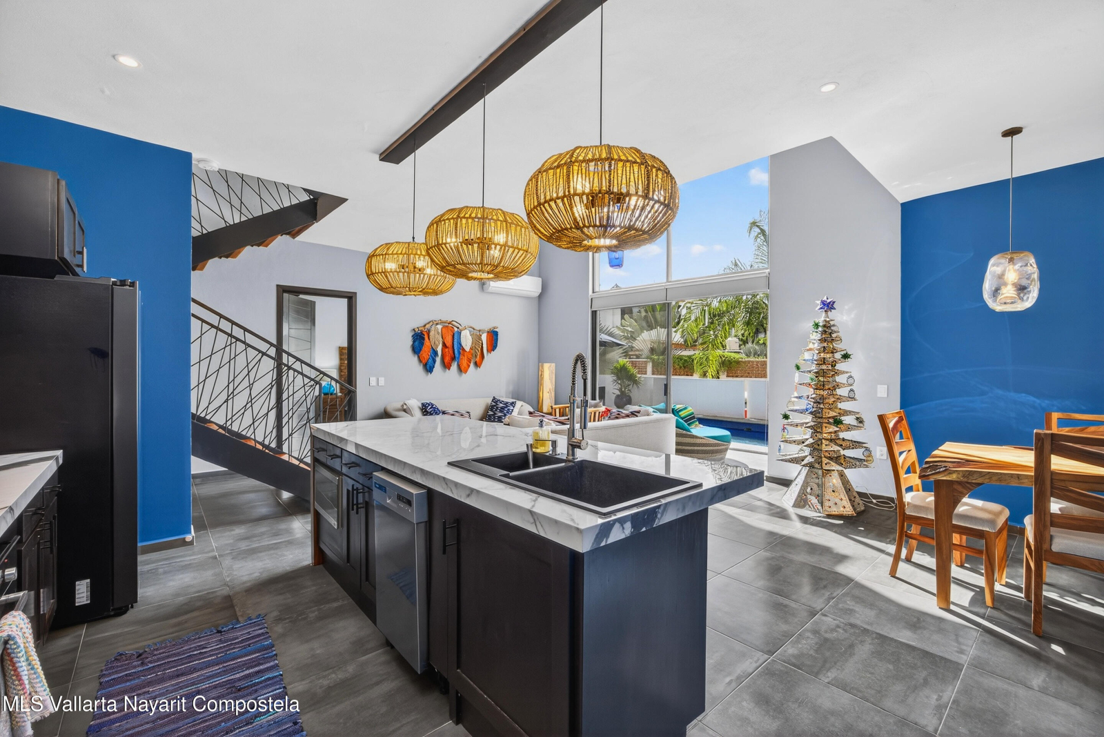 Casa Sol y Danza is a new modern home with ample natural light, an open kitchen with large prep island and open shelving. The focal point of the kitchen and living area is through large windows and sliding doors that open to a beautiful ornate pool complete with a shallow end for kids and/or just chillin’ with margaritas, surrounded by a large patio and outdoor bar lounge. It has three bedrooms, 3.5 bathrooms and a flex room that could be used as a gym, office, kids playroom or AV room. There is potential to put a pergola on the roof to catch evening sunsets reflected off the mountains that border the South end of San Pancho beach. Casa Sol y Danza is a 10 minute flat walk to the beach and all San Pancho restaurants and shops.