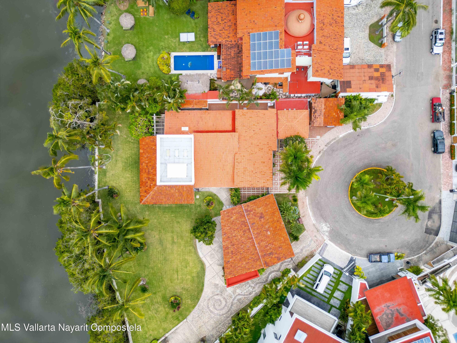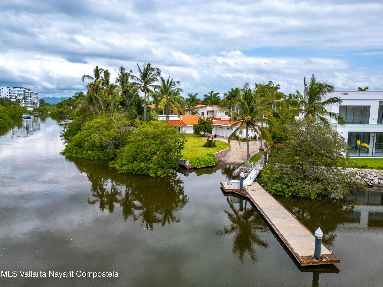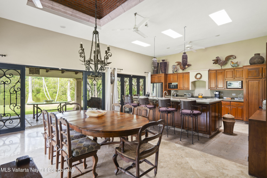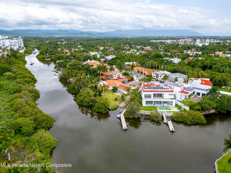 Beautiful house in Nuevo Vallarta with a view to a huge garden area full of trees, palm trees and also the natural canal! This is a single level house, it has carport for 2 cars, huge garage/storage, with a boat included! Beach? The closest is just 9 min away by car. Garden area has a charcoal BBQ grill and a small dock where you can park your boat. This house also offers a separated maids living quarter, there is a security guard at the entrance of the residential and very impotant to mention that this property used to be 2 lots! That is why it has such a outside space.Nuevo Vallarta area is well known for its large sidewalks where you can walk with your pets, jog or be on your bicylce. Also, its one of the neighborhoods that has a lot of restaurants, bars and coffeshops