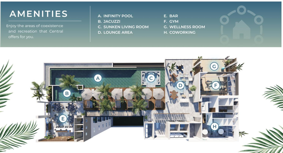 Introducing CENTRAL residences, the newest development in the Versalles neighborhood of Puerto Vallarta. Central will have 47 condos, of which 11 are type A, 24 type B and 12 type C. They range from 1 Bed + Den (type A), 2 Bed 2 Bath (Type B), 2 bed 2 bath + Lock off 1 bed 1 bath (Type C). Thirteen of those units will have mesmerizing ocean views. With an array of incredible rooftop amenities, Central will redefine luxury living – with an infinity pool that seemingly merges with the ocean and city, a fitness center, wellness room, co-working room, Bar and Jacuzzi all facing the ocean and mountain views. Underground parking and Bodega are a purchasable option to add onto your great Living Investment! Invest in your dream, invest in Versalles, Invest in Central!