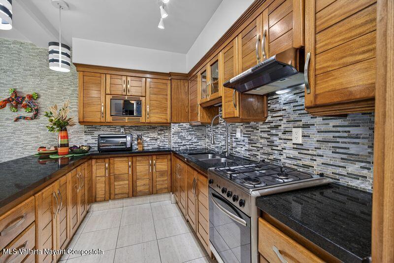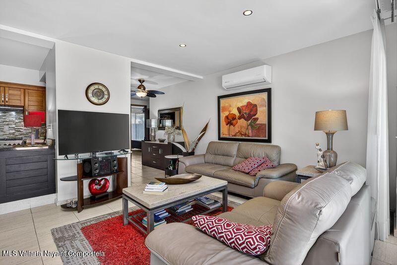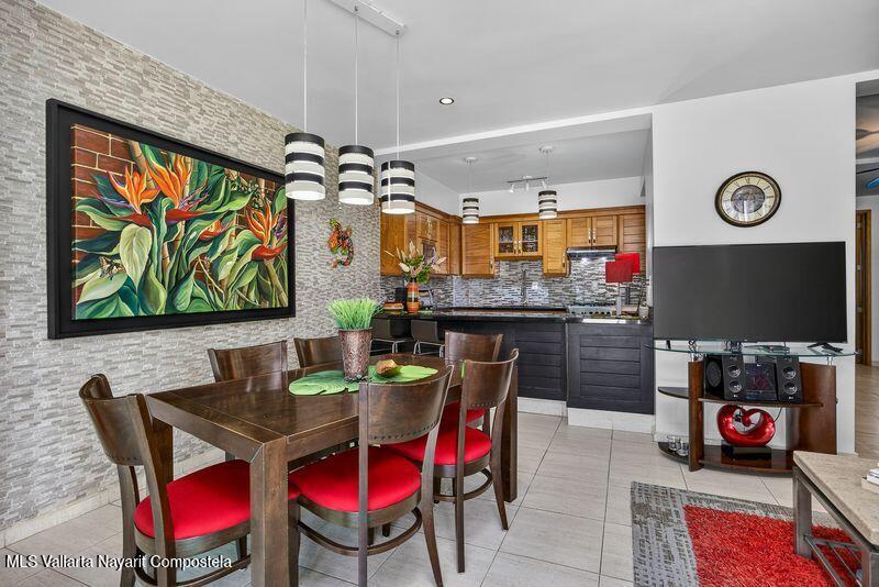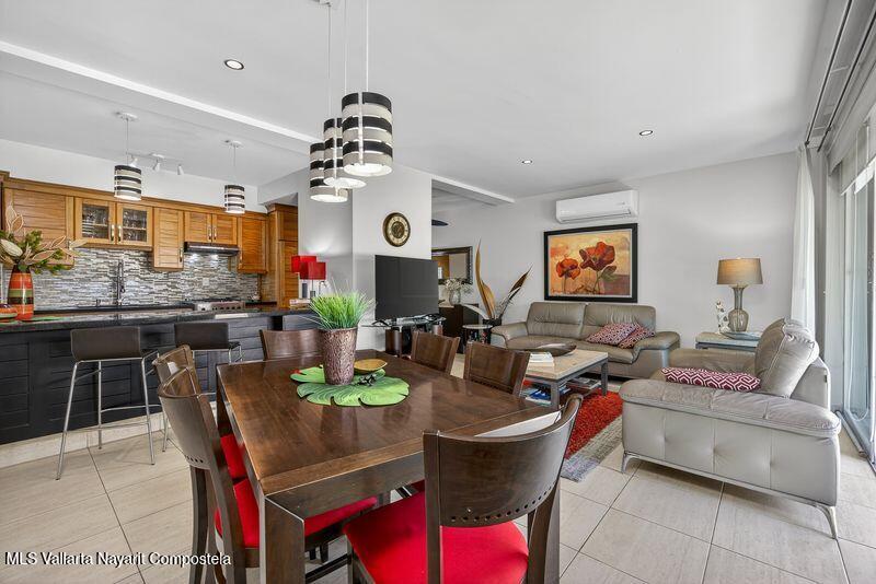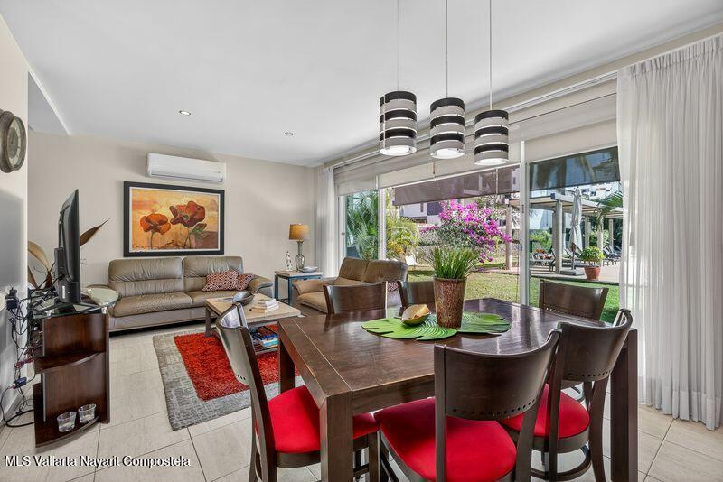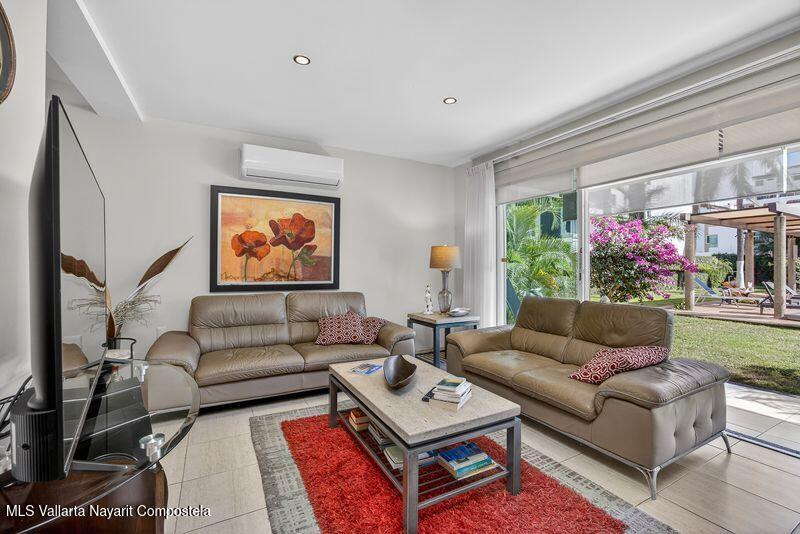 Beautiful large 3 bedrooms 2 bathrooms ground floor corner unit located in one of the most desirable area of Puerto Vallarta. Close by Shopping Mall, Restaurants, Stores, COSTCO. Comes fully furnished TURN KEY. High End finishes with tropical wood, granite counter top and marble vanities. Large wrap around terrace with a shade area. Easy access. Features 2 private parking space with electric gate opener.