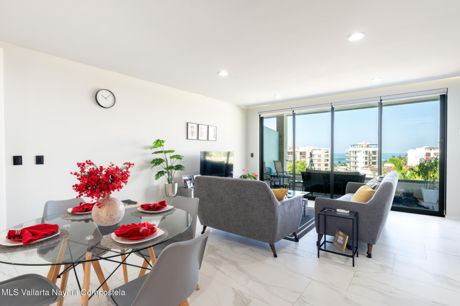 Welcome to the newly built two-bedroom 2 and a half bathroom , condo located on the third floor of the luxurious Quadrant community in Bucerias, Nayarit. This resort-style condominium community is situated along the Tepic-Puerto Vallarta highway in Banderas Bay and sits on a hill that offers spectacular views of the ocean, community gardens, and surrounding amenities walking distance to restaurants local businesses and a amazing beach The condo comes with assigned parking and has a wrap-around balcony allowing you to enjoy the ocean and mountain views. Being the corner unit and having the third-floor balcony is what it takes to have the perfect vantage point to take in the stunning sunsets over the ocean