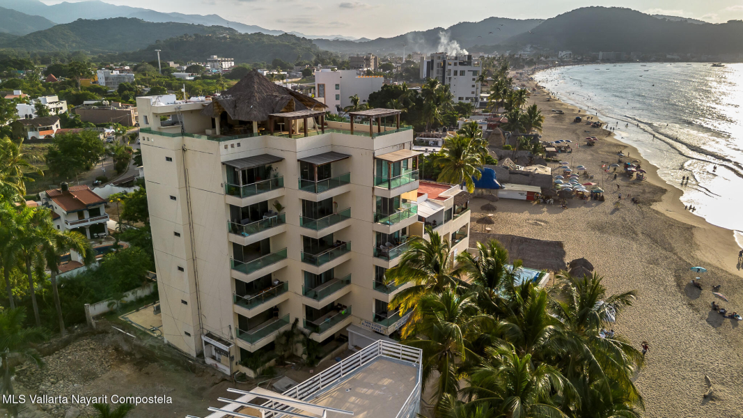 Welcome to a rare beachfront offering in beautiful Rincon de Guayabitos on Mexico’s Riviera Nayarit condominium positioned right on the beach, just steps from the water’s edge.This condo shares an exquisite infinity pool that appears to merge seamlessly with the bay beyond, creating a dramatic and relaxing setting where you can watch the sunset over the water.From the pool terrace and the generous terrace you’ll enjoy sweeping views across the bay to the island just offshore Isla Coral visible in the distance, inviting snorkelling excursions, or simply serving as a stunning natural backdrop to your coastal lifestyle.