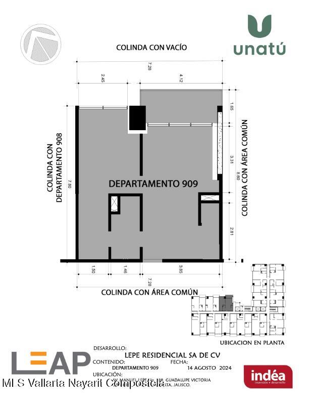 Ubicado en Calle Manuel Lepe, Col. Guadalupe Victoria, una de las zonas con mayor crecimiento y plusvalia en Puerto Vallarta, UNATU ofrece alta conectividad al aeropuerto, central camionera, centros comerciales y playas. Desarrollado por INDEA, cuenta con 116 departamentos en 10 niveles + rooftop, amenidades premium, estacionamiento y bodegas. Entrega estimada abril 2028. Mantenimiento aprox. $45 MXN/m.