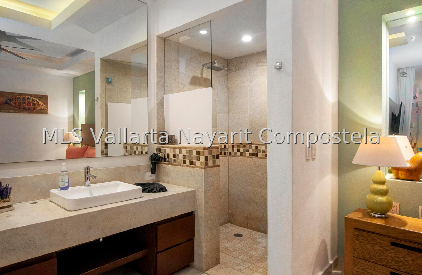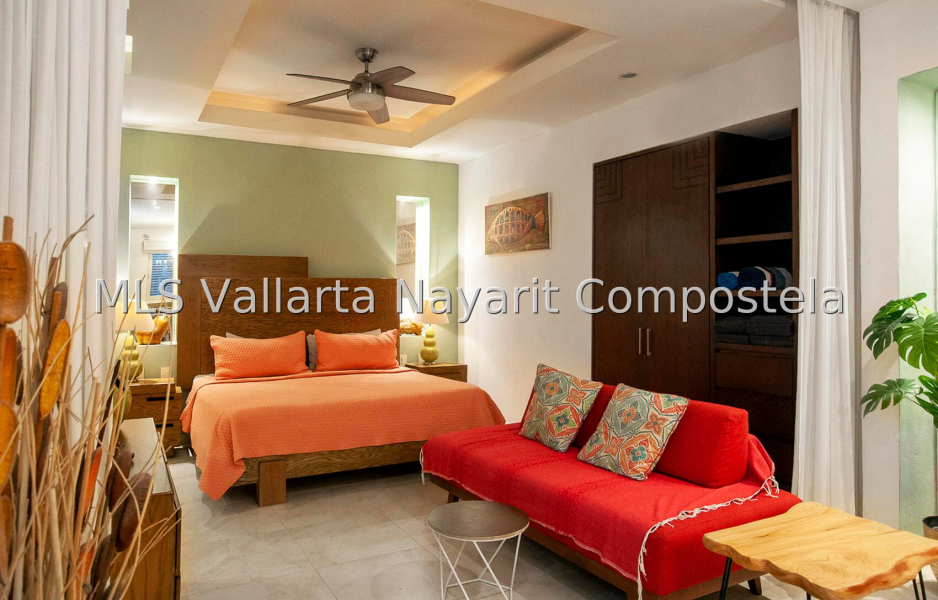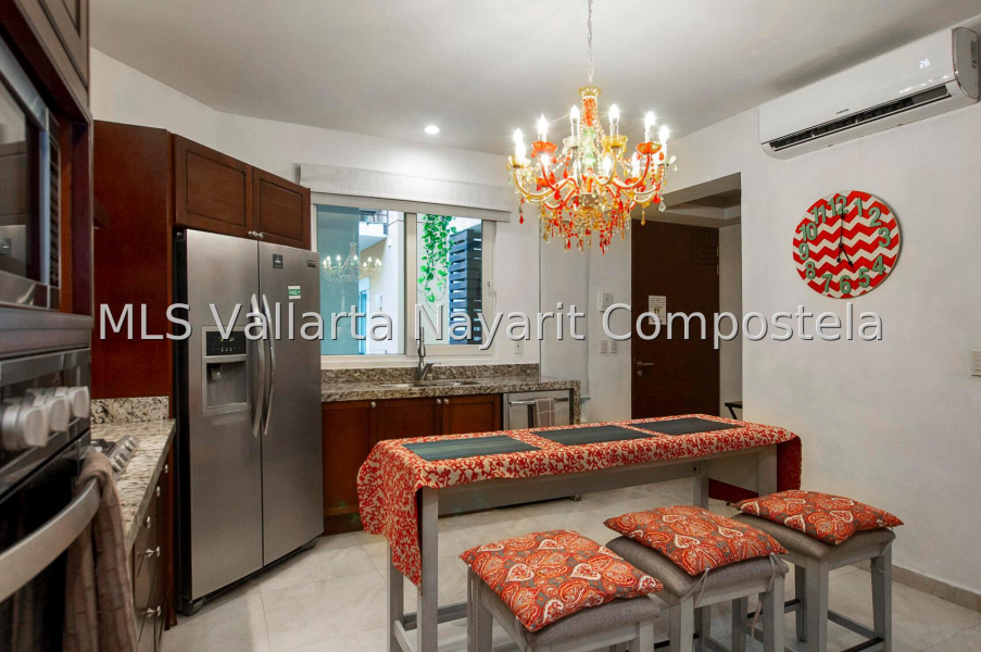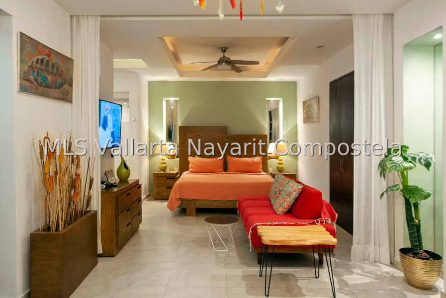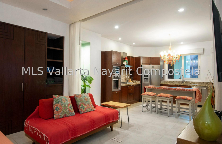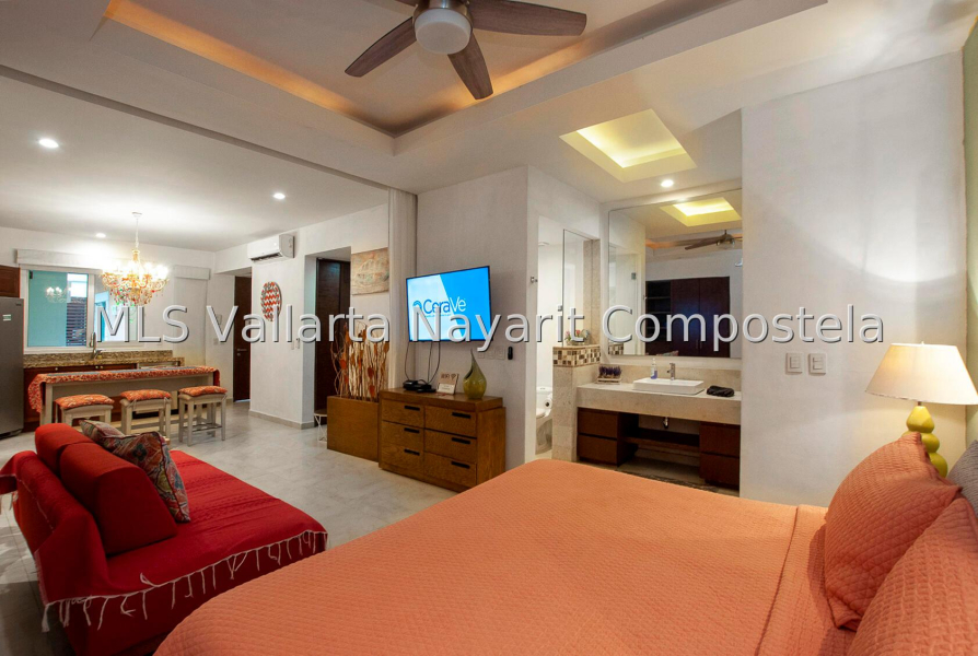Unit 509 at V399 Condominium is unique and sophisticated, featuring seclusion and comfort. The 7th-floor rooftop terrace features a heated infinity pool, one Jacuzzi, a gas barbecue grill and bar area, dining, lounging, and socializing areas, and a sweeping 360-degree view of the Bay of Banderas, the Sierra Madre Mountains, and the city lights of Puerto Vallarta. This remodeled studio, 1 full bath condo, offers 1 King-Bed, 1 Mini Split air-conditioner,high-speed Wi-Fi internet, 1 flat screen smart TV, a fully equipped kitchen with all necessary appliances, including a microwave, oven, refrigerator, and a gas cooktop. This condo also offers a full-sized washer and dryer. INCLUIDE A PRIVATE STORAGE IN THE BUILDING