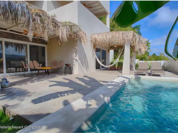 Hermosa casa de tres niveles con Rooftop a solo unas cuadras de la plaza principal de Sayulita.En el primer nivel encontraras el area de sala, comedor y el area de cocina, equipada con una amplia cocina integral. Este nivel tambien cuenta con area de lavado, un bano completo, terraza, jardin y una alberca privada.En el segundo nivel, destaca un espacio tipo Flex que conecta las cuatro amplias habitaciones, cada una con bano privado. Todas las recamaras cuentan con grandes ventanales, lo que garantiza excelente ventilacion y abundante luz natural.En el tercer nivel se encuentra el Roof Garden, que incluye dos amplias terrazas y un bano. Una de las terrazas cuenta con jacuzzi, y ademas, el espacio del techo es ideal para la instalacion de paneles solares.