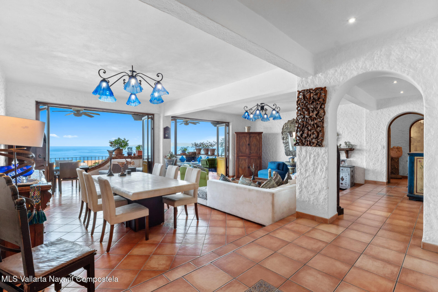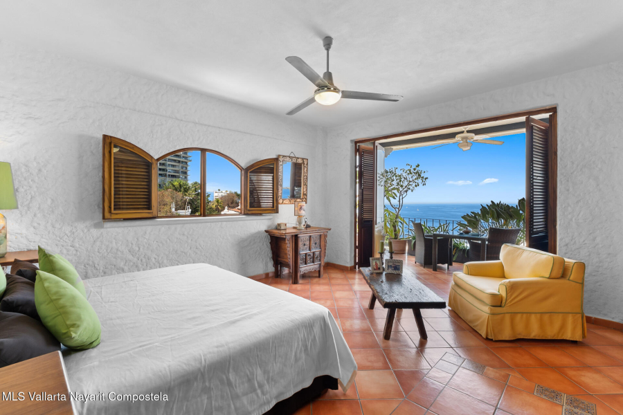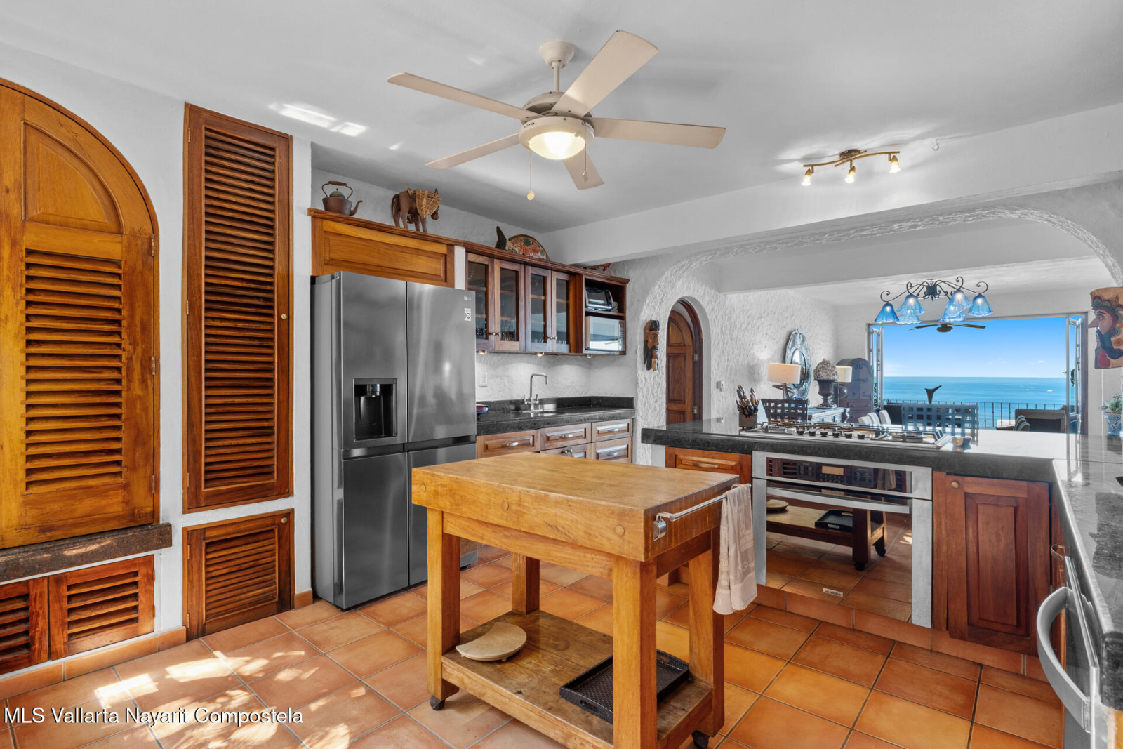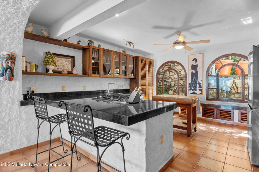 A Condominium with the Feel of a Private Villa! This exceptional second-floor residence, located in a charming and serene boutique complex, offers the ultimate blend of privacy, comfort, and breathtaking panoramic views of the entire bay. One of its most unique features is the included 50% ownership of the lot in front, guaranteeing that your stunning views remain unobstructed forever. Designed for both relaxation and entertaining, the open-concept living and dining areas flow seamlessly onto a wonderfully spacious covered terrace. The fully equipped kitchen is both functional and stylish, featuring solid wood cabinetry, peninsula counter with bar seating, and granite countertops and custom stained-glass windows allowing ample light to the space.